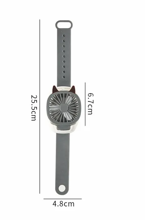 A custom wristband mini fan is a portable 10" × 2.6" fan made from ABS and PP plastic with a silicone wristband handle, designed for hands-free cooling and convenience. Featuring a 500mAh rechargeable battery and a 3-inch detachable handle, this fan combines practicality with fun.