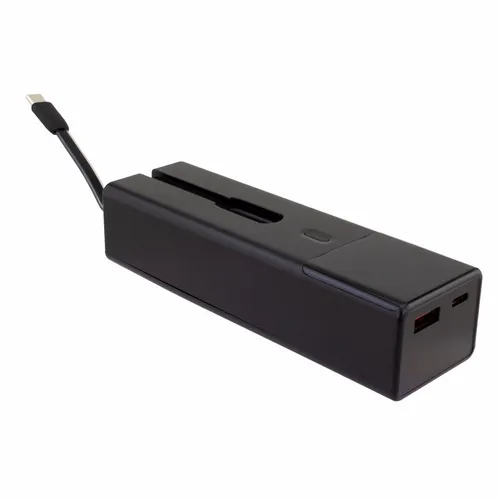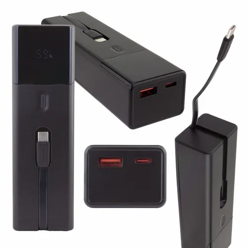 A laptop and smart phone power bank with a built-in cable for input/output. A perfect blend of function and size. It's the smallest power bank with 100W output to charge all laptops with a type-C power port. Specifications: Battery: LI-ION Battery USB-A Output: 5V /2.1 A;9V /2.0A; 12V / 1 .SA; 1 0V /2.25A TYPE-C Output & Input: 5V /3.0A;9V /3.0A; 12V /3.0A; 15V /3.0A;20V /5.0A Built-in TYPE-C Cable Output & Input: 5V /3.0A;9V /3.0A; 12V /3.0A; 15V /3A;20V /5.0A Capacity: 10