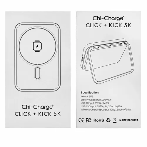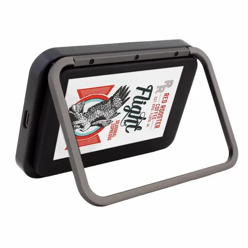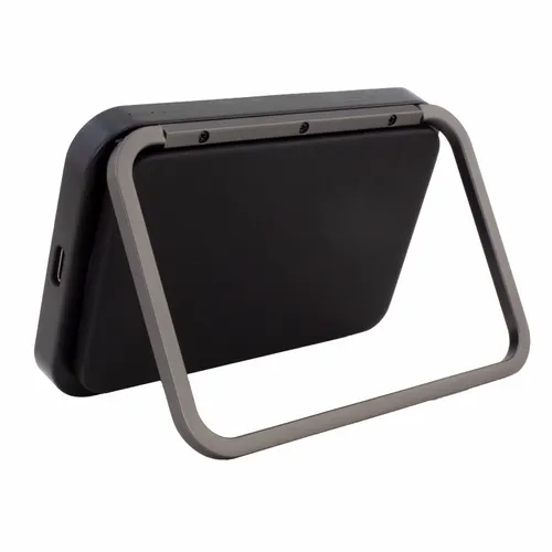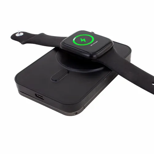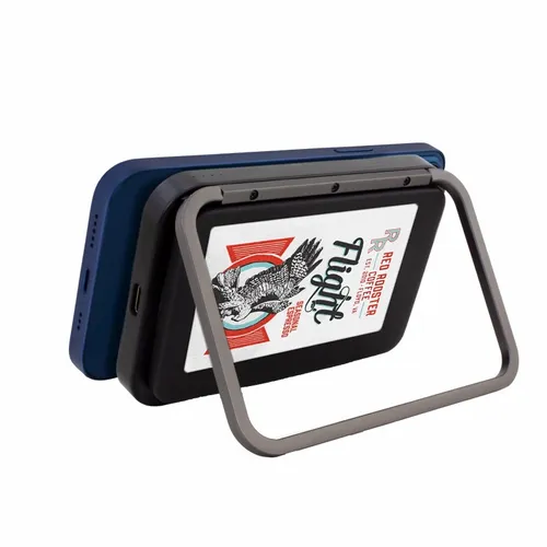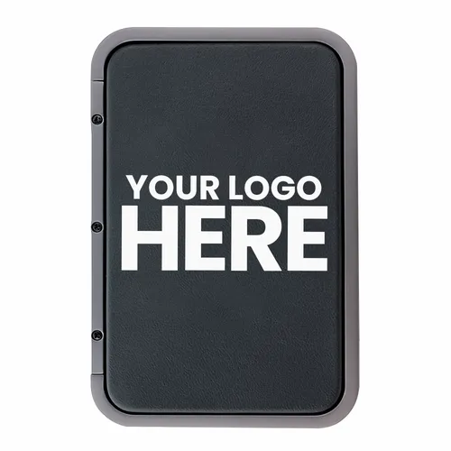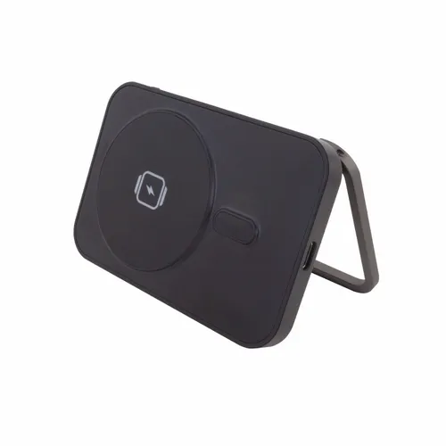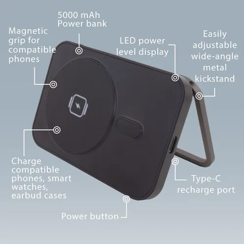 Coming soon. The Wireless Charging Leatherette 5000 mAh Power Bank with Phone Stand is compact, stylish, and helps keep your phone charged. It keeps a magnetic hold on your phone while wirelessly charging your phone. It's a great gift for any business team. It looks great on any compatible phone and helps streamline a busy day by reducing the cord clutter in your bag or pocket. It also comes with an attached outer frame that pivots outward at an angle to use as a stand for your phone.