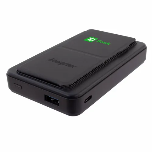 A great looking Energizer power bank with 10,000 mAh battery capacity. Magnetically holds to newer compatible phones. It also has a convenient foldout stand to prop up on a desktop surface to keep your hands free. It's a great device for daily use for any busy professional. Specifications: Model Name: QM10004PQ Cell Type: Lithium Polymer Battery Capacity: 10000mAh/38.5Wh(Max.) Rated Input: USB-C PD 5V/3A, 9V/2A Rated Output 1: USB-A 4.5V/5A, 5V/4.5A, 5V/3A, 9Vl2A, 12V/1.5A