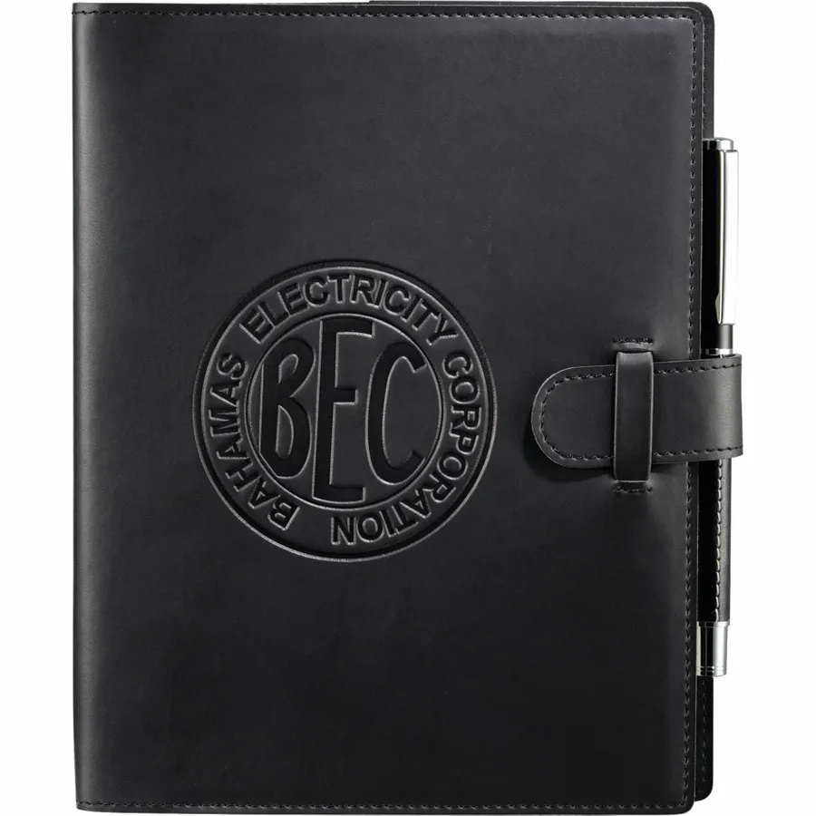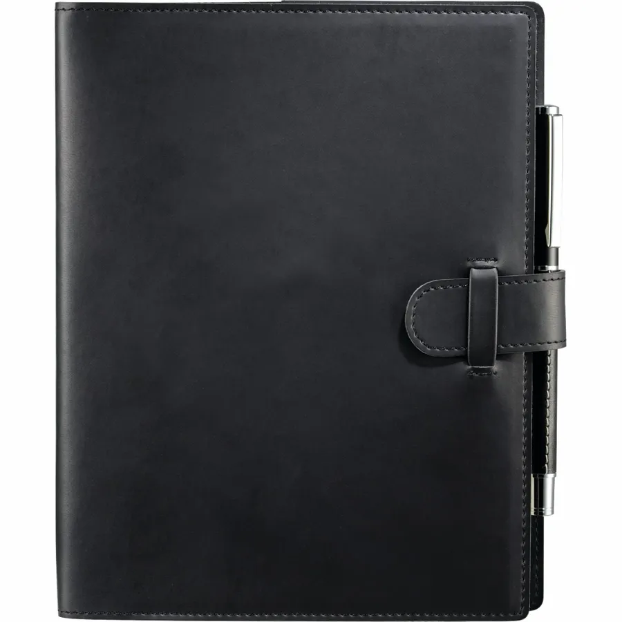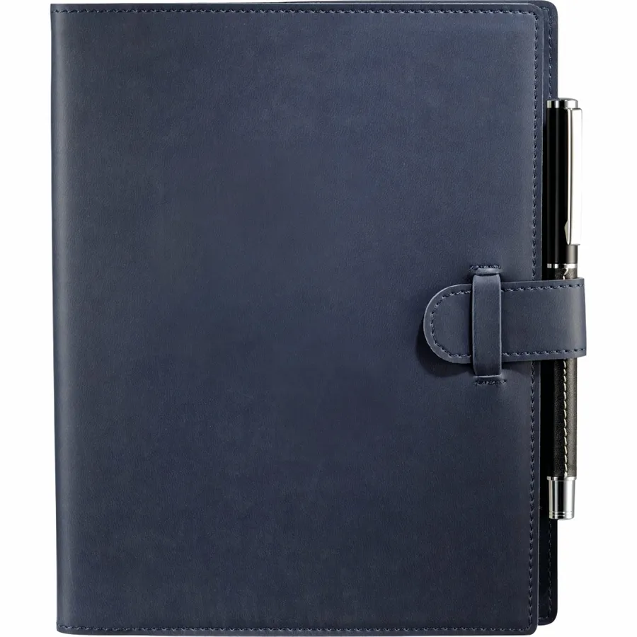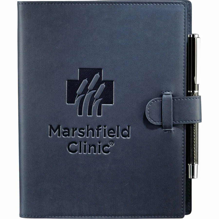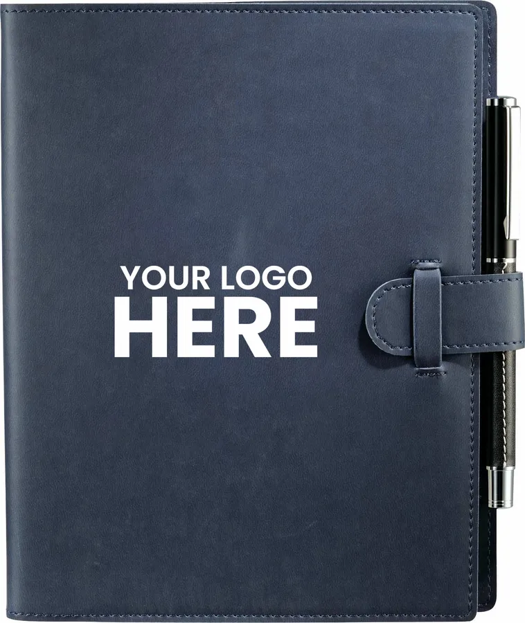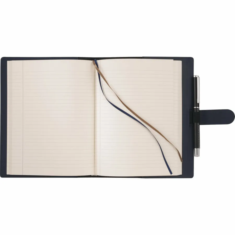 The 6.5 x 8.25 FSC Mix Dovana™ Journal includes a business card slot, elastic pen loop (pen is not included), and tab-and-loop closure. This customizable notebook features blue and silver ribbon page markers. The Dovana™ Journal includes 80 sheets FSC Mix white lined paper refill.