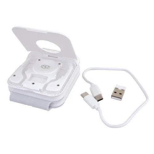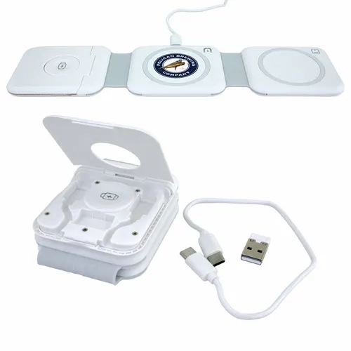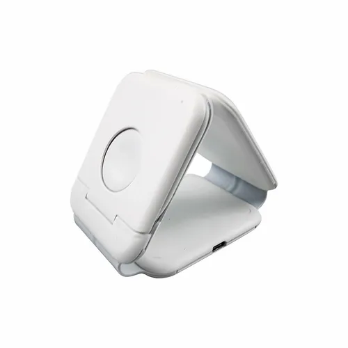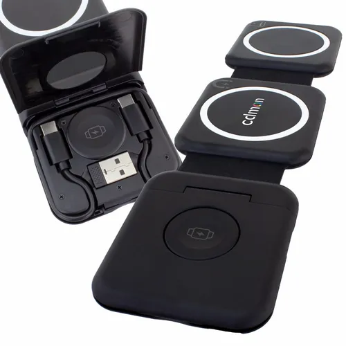 Compact wireless charger for charging up a phone, smart Watch, and ear buds at the same time. Much like our original Stack model, this version features a compartment that conveniently stores a USBC-to-USBC cable.