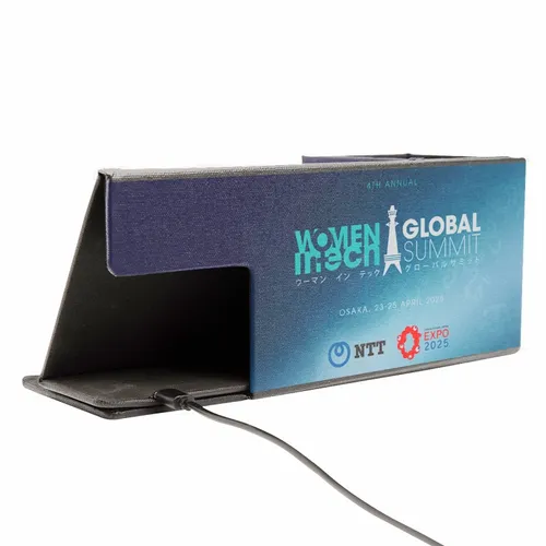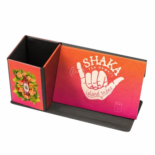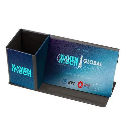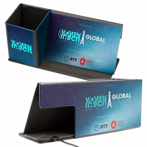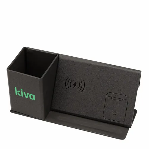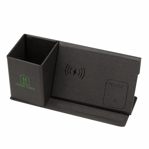Coming end of April. The Chi-Charge Desktop Organizer offers ample branding space with full-color printing, making it perfect for showcasing your brand and communicating your message effectively. It features a fast 15W wireless charging spot for phones and a dedicated charging spot for AirPods. Plus, it’s designed for easy storage and shipping, as it can be shipped flat. It also has a Type-C input, pen holder, detachable dry-erase board, and marker.